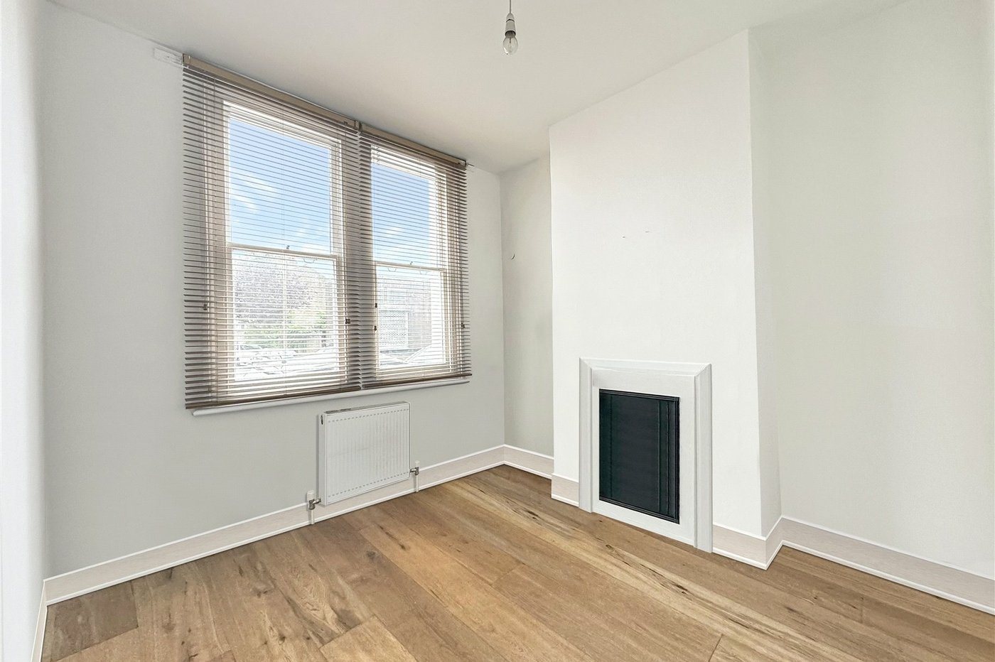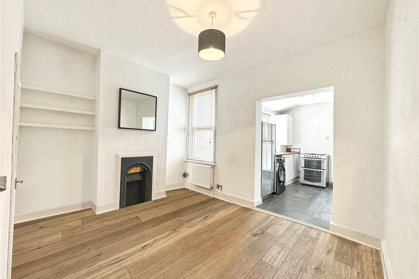 Feature period style fireplace, wood laminate flooring.