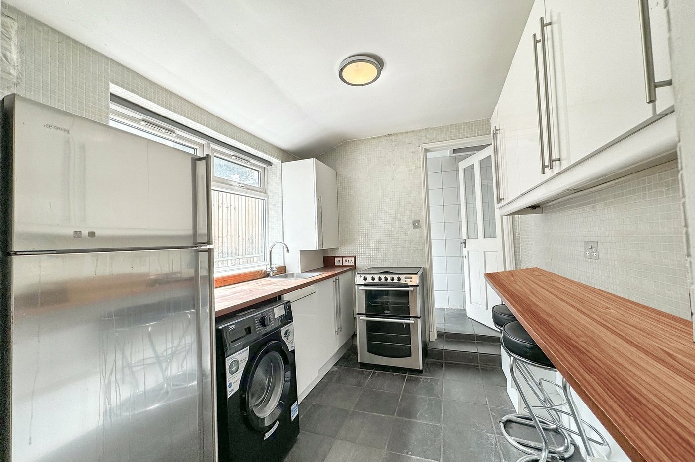 Fitted with a range of wall and base units with complimentary work surfaces, space for appliances, tiled flooring.