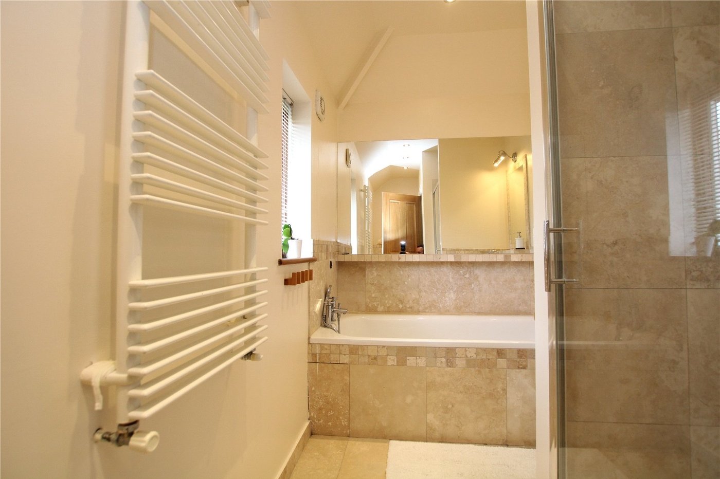 Fitted with a four piece suite comprising of a tile sided bath, walk in shower cubicle, vanity wash hand basin with storage under and a cistern enclosed WC. Part tiled walls and tiled flooring.