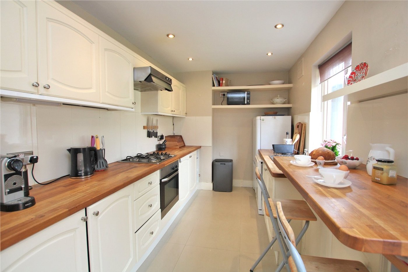 Fitted with a range of wall and base units with complimentary work surfaces. Integrated oven, gas hob and filter hood. Space for appliances, breakfast bar, part tiled walls and tiled flooring. Door to rear garden and lobby.