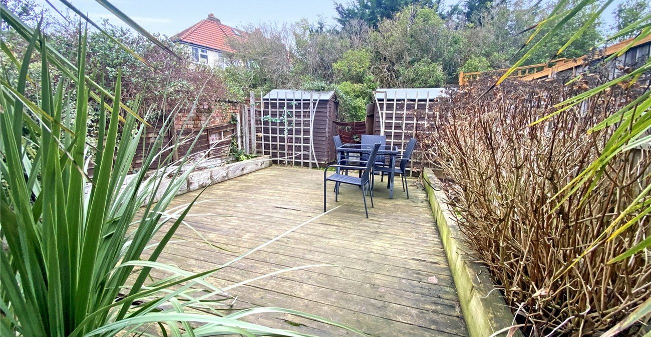 Rear GardenSlate patio area, mainly laid to lawn, mature trees, shrubs and bushes, decking area to rear, gate to side,