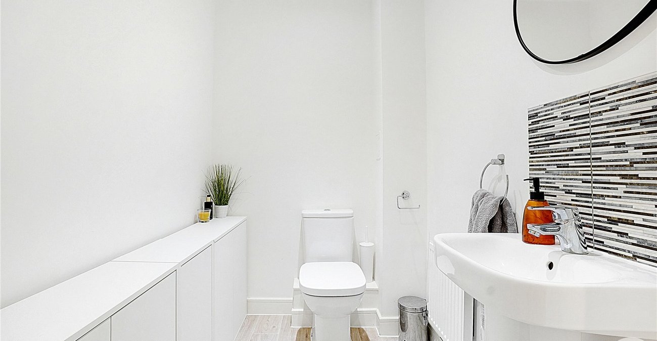 Cloakroom: 1.8m x 1.42mLow level WC. Pedestal wash hand basin with tiled splashback. Radiator. Spotlights. Laminate flooring.