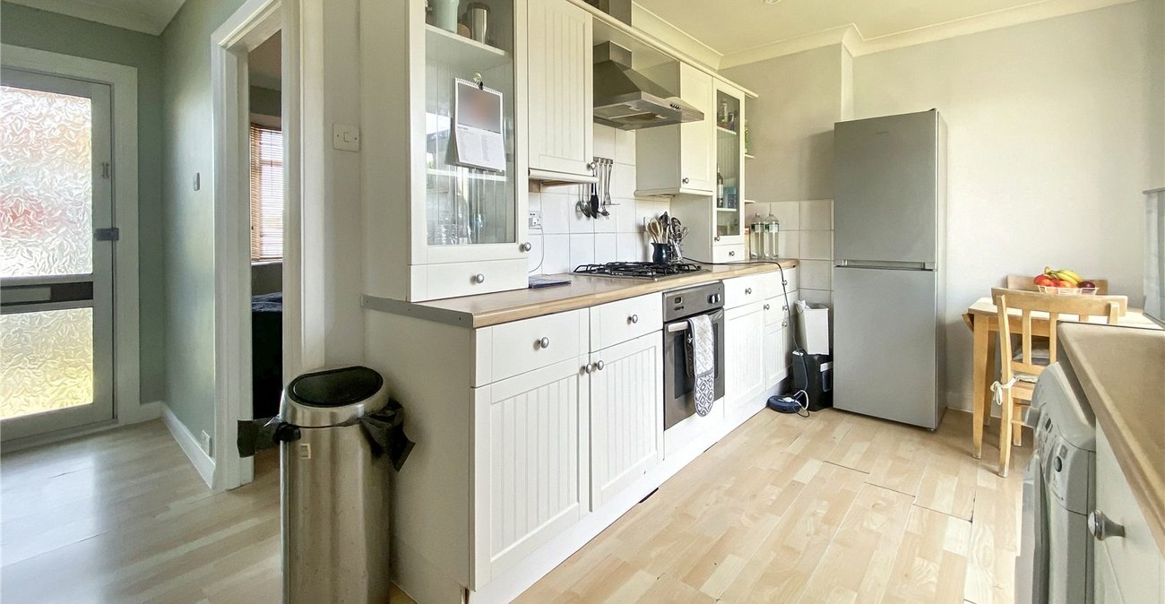 Kitchen/Diner 4.98m x 2.36mDouble glazed windows to rear, double glazed door to garden, coved ceiling, range of wall and base units, stainless steel sink unit with drainer and mixer tap, wall mounted boiler, plumbed for washing machine and dishwasher, space for fridge/freezer, integrated oven hob and extractor hood, radiator, laminate flooring.