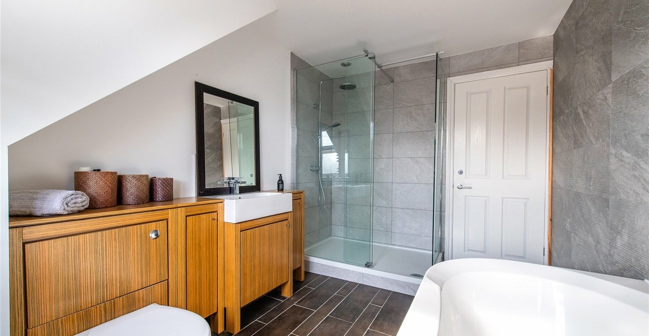 Bathroom 3.6m x 2.34mWalk in shower, free standing bath, basin, WC, door