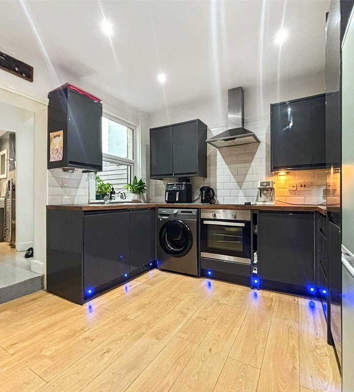 Kitchen: 4.34m x 2.74mLaminate flooring, double glazed window to rear. Double glazed door to rear. Range of wall and base units. Sink drainer. Electric hob. Extractor fan. Radiator. Storage cupboard.