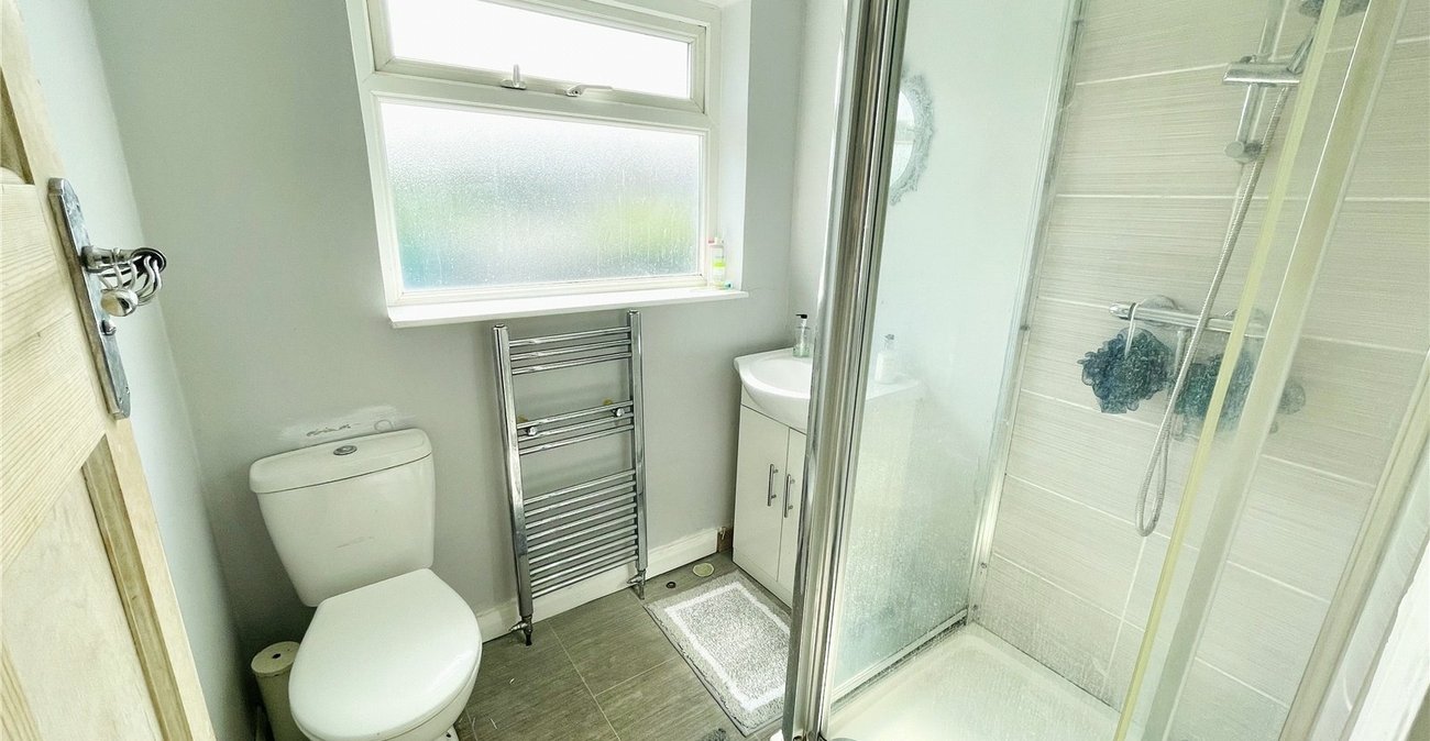 First Floor Shower Room 1.73m x 1.65mDouble glazed frosted window to rear, shower cubicle, low level w.c, wash basin set in vanity unit with mixer tap, chrome heated towel rail, part tiled walls, vinyl flooring.