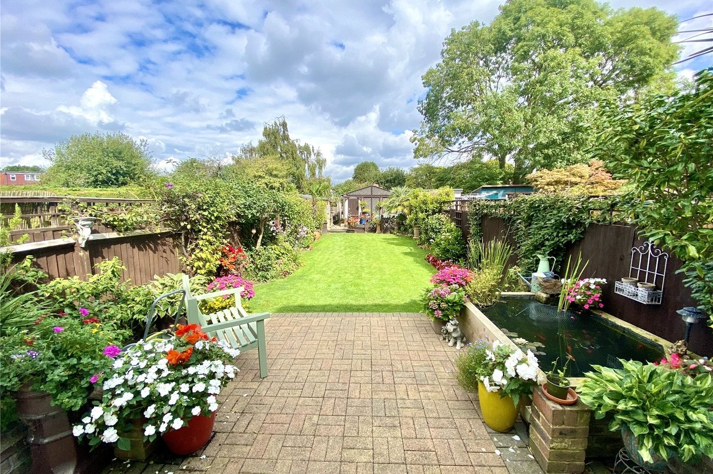Rear Garden Approximately 98ftPaved patio area, pond, laid to lawn, established borders, decking to rear, rear access.