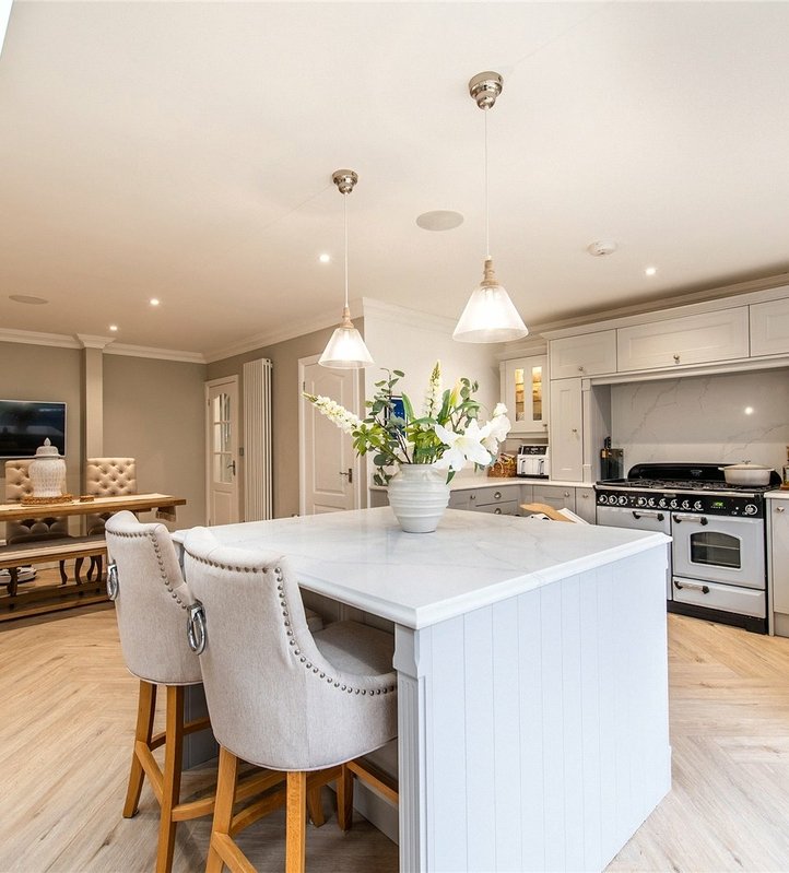 Kitchen 8.23m x 3.12m2 x Double glazed windows to rear. Double glazed French doors to garden. Modern fitted wall and base units with worktops over. Built in Bosch double oven, hob and extractor. Integrated fridge. Integrated freezer. Integrated dishwasher. Single sink and drainer unit with mixer tap. Tiled floor. Coved ceiling. Inset spotlights. Breakfast bar. Radiator. Access to utility room.