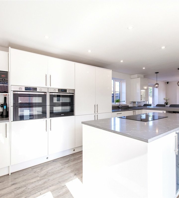 Kitchen 5.54m x 4.62mDouble glazed window to rear. Double glazed sliding patio door to conservatory. Modern fitted wall and base units with roll top worksurfaces. Sink and drainer unit with mixer tap. Space for appliances. Inset spotlights. Log burner. Display cabinets.